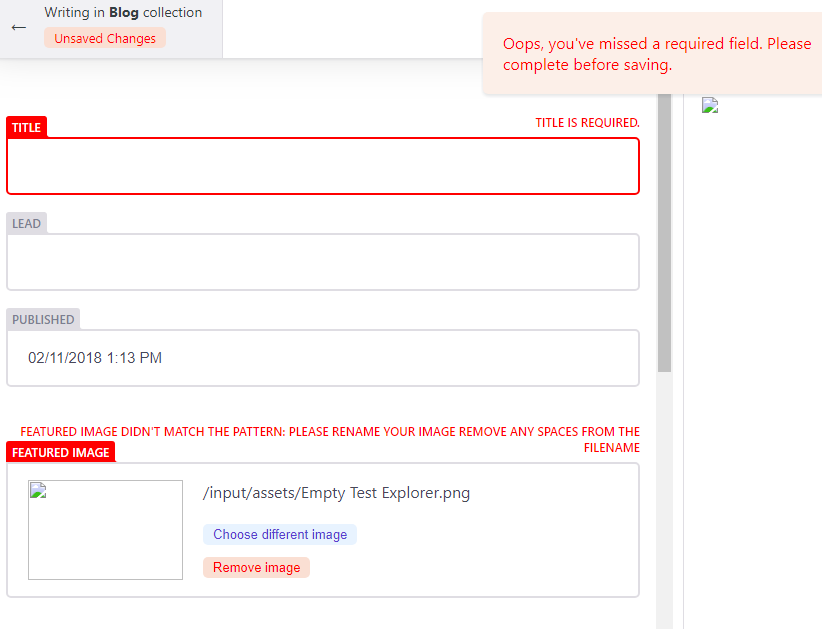 - {label: "Featured Image", name: "Image", widget: "image", optional: true, required: false, pattern: ['^\S*$', "Please rename your image remove any spaces from the filename"]}